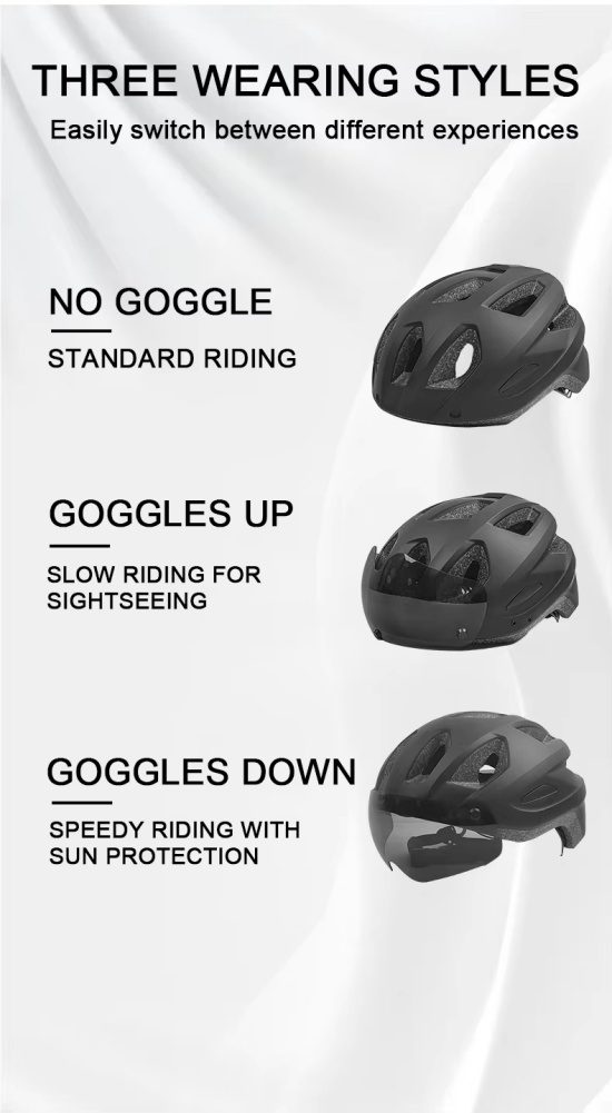 Featuring a magnetic, removable visor with three easy-to-switch modes: standard, flipped-up for sightseeing, and flipped-down to protect against wind and sun during faster rides.