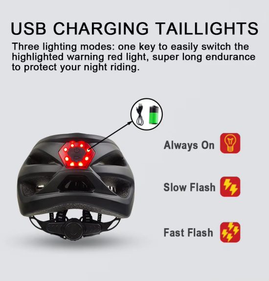 - Absolutely. The helmet features a USB rechargeable tail light with multiple flash modes, keeping you visible and safe in low-light conditions.