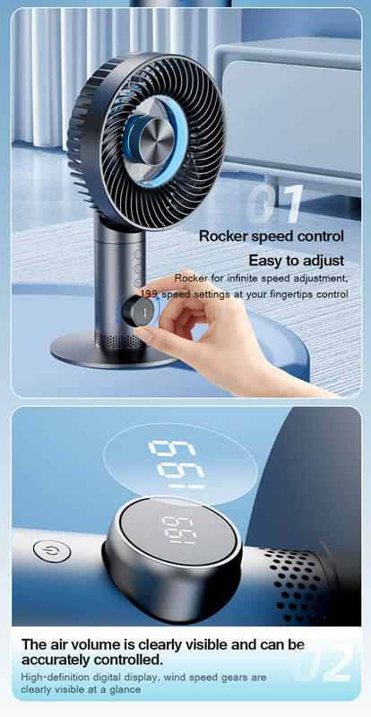 Features a floating display that shows speed and battery level at a glance. With a 9-hour timer, the fan can automatically turn off for energy-saving convenience.