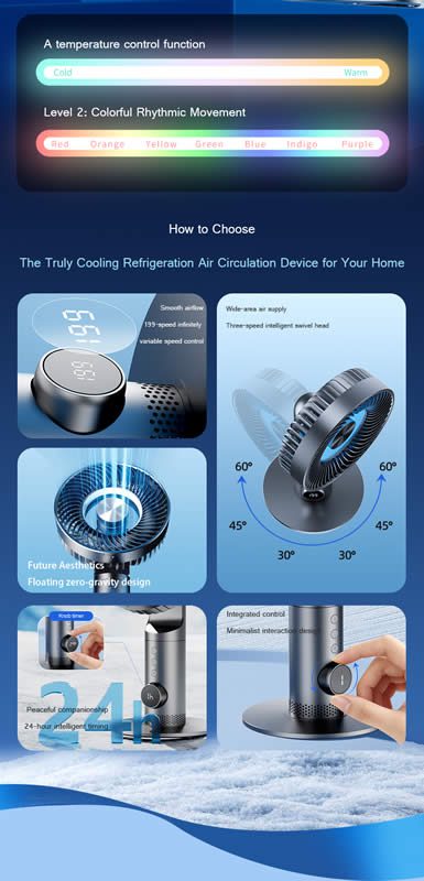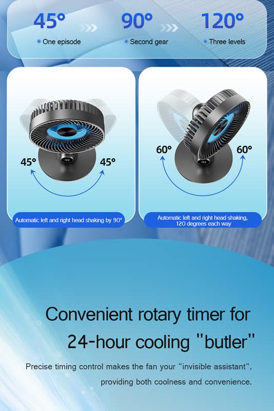 With 1–199 stepless speed levels, you can easily adjust airflow from gentle breeze to strong wind. Choose 45°/60°/90°/120° oscillation for full coverage and precise cooling.